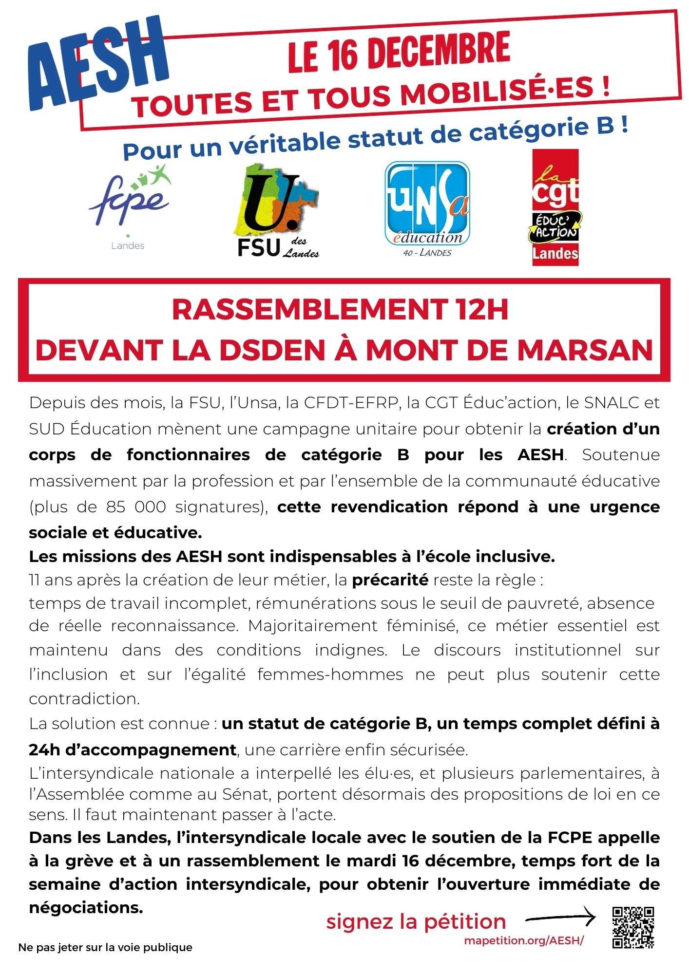 La FSU toujours mobilisée pour les AESH, après avoir soutenu la lutte courageuse des AESH de Tarnos, le 16 décembre, mobilis.é.es et en grève pour les droits des AESH dans les Landes : rassemblement 12h devant la DSDEN à Mont de Marsan
